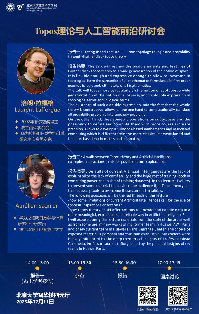 报告人介绍:Aurélien Sagnier is a mathematician who obtained his PhD in 2017. His first field of study was topos theory and number theory (especially the program of Connes and Consani in number theory). He has joined Huawei in August 2022 as a research engineer. He is now in charge of an internal project whose aim to apply to AI the topossic insights of Professsor Olivia Caramello and of Professsor Laurent Lafforgue."