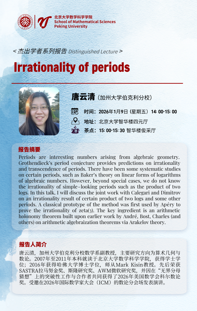 报告摘要: Periods are interesting numbers arising from algebraic geometry. Grothendieck’s period conjecture provides predictions on irrationality and transcendence of periods. There have been some systematic studies on certain periods, such as Baker’s theory on linear forms of logarithms of algebraic numbers. However, beyond special cases, we do not know the irrationality of simple-looking periods such as the product of two logs. In this talk, I will discuss the joint work with Calegari and Dimitrov on an irrationality result of certain product of two logs and some other periods. A classical prototype of the method was first used by Apéry to prove the irrationality of zeta(3). The key ingredient is an arithmetic holonomy theorem built upon earlier work by André, Bost, Charles (and others) on arithmetic algebraization theorems via Arakelov theory.