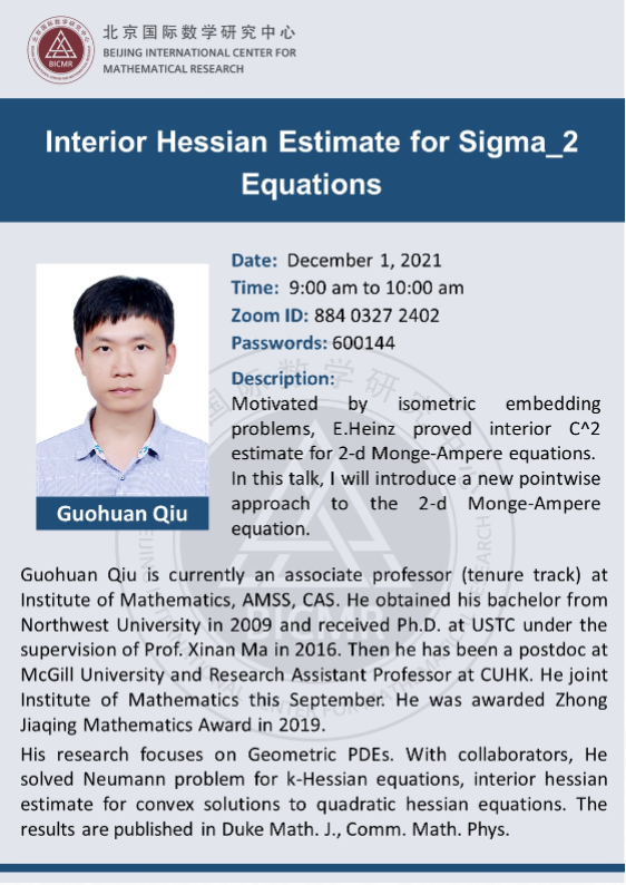 Guohuan Qiu is currently an associate professor (tenure track) at Institute of Mathematics, AMSS, CAS. He obtained his bachelor from Northwest University in 2009 and received Ph.D. at USTC under the supervision of Prof. Xinan Ma in 2016. Then he has been a postdoc at McGill University and Research Assistant Professor at CUHK. He joint Institute of Mathematics this september. He was awarded Zhong Jiaqing Mathematics Award in 2019.