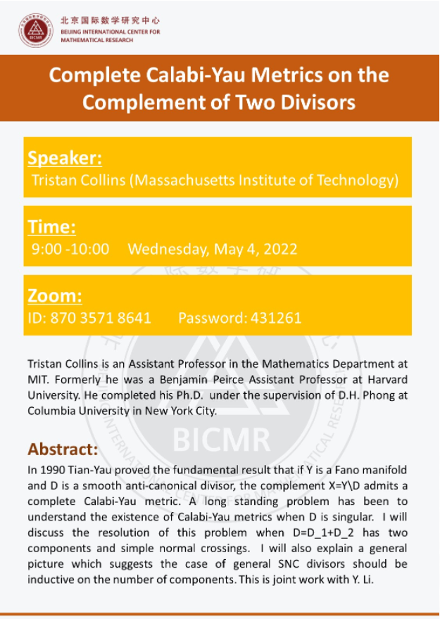 Tristan Collins is an Assistant Professor in the Mathematics Department at MIT. Formerly he was a Benjamin Peirce Assistant Professor at Harvard University. He completed his Ph.D. under the supervision of D.H. Phong at Columbia University in New York City.