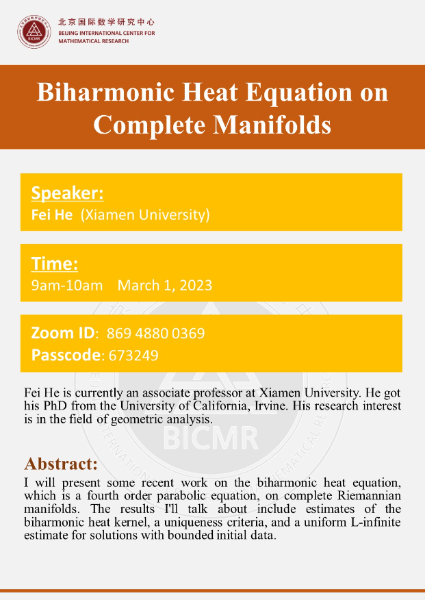 Speaker: Fei He is currently an associate professor at Xiamen University. He got his PhD from the University of California, Irvine. His research interest is in the field of geometric analysis.